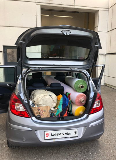 Zum Abschluss organisierten wir die Konfektion. Wir entschieden uns selbst an die Nähmaschinen zu sitzen. Gemeinsam mit Freund*innen und Familie schnitten, nähten und verpackten wir die Tücher in liebevoller Heimarbeit.
